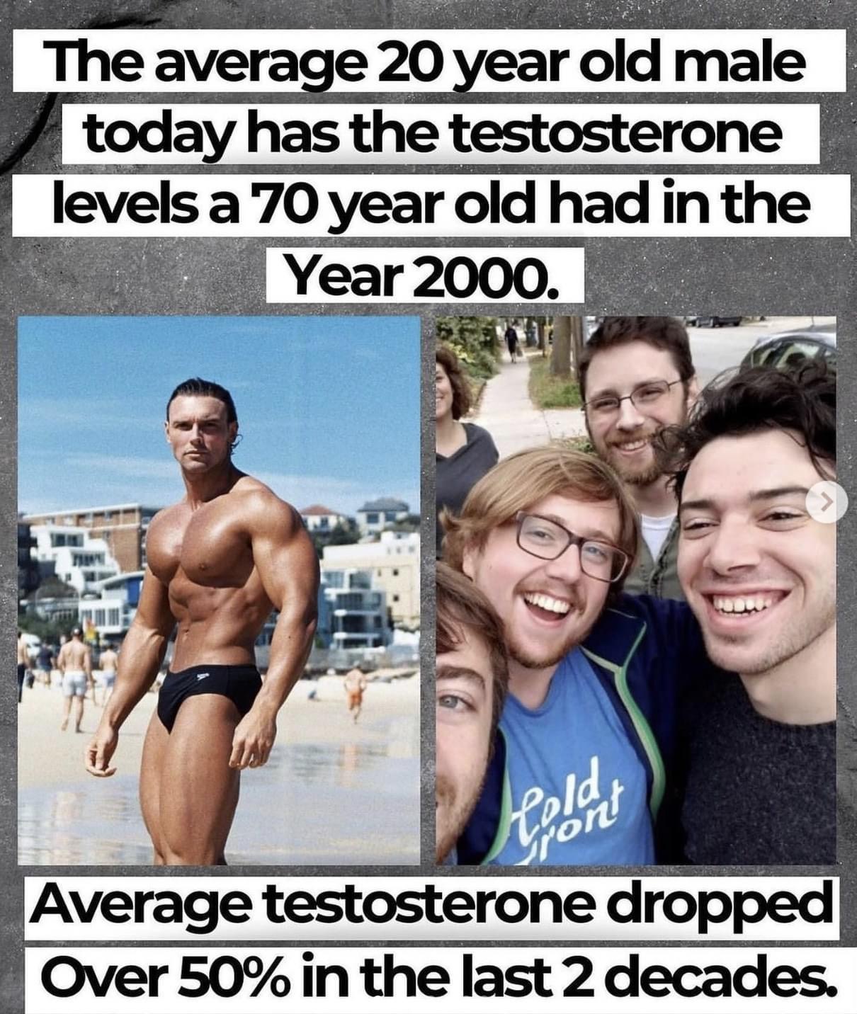 Aber er fällt auch innerhalb der Alterskohorten, je nach untersuchter Region in den letzten 5o Jahren um bis zu 15-30%. (Forschungsübersicht hier) Wir verlieren buchstäblich unsere Männlichkeit, ganz konkret physisch!